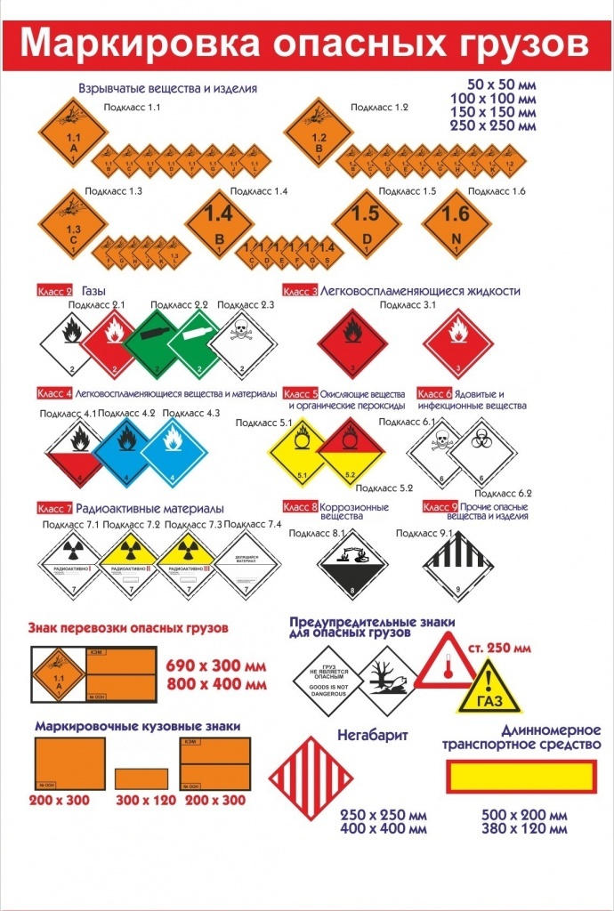 В целях настоящих правил к опасным грузам относятся любые вещества, материалы, изделия, отходы производственной и иной деятельности, которые в силу присущих им свойств и особенностей могут при их перевозке создавать угрозу для жизни и здоровья людей, нанести вред окружающей природной среде, привести к повреждению или уничтожению материальных ценностей. Опасные грузы по требованиям ГОСТ 19433-88 Грузы опасные Классификация и маркировка и ДОПОГ распределяются на следующие классы:
