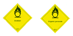 Класс 5. Окисляющие вещества и органические пероксиды, которые способны легко выделять кислород, поддерживать горение, а также могут, в соответствующих условиях или в смеси с другими веществами, вызвать самовоспламенение и взрыв.